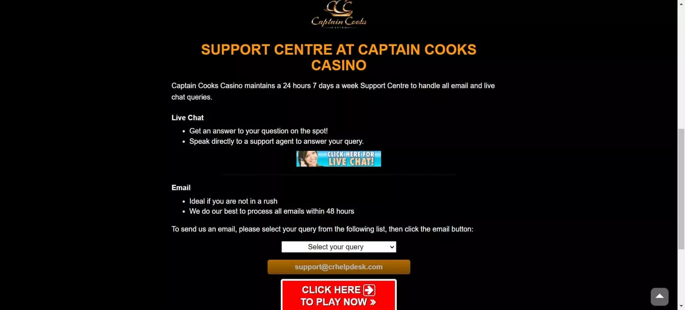 V prípade nejakého problému pri hraní v kasíne Captain Cooks vám naša redakcia odporúča využiť služby zákazníckej podpory kasína, ktorú môžete využiť 24/7 prostredníctvom živého chatu alebo e-mailu. Pre slovenských hráčov je dôležité podotknúť, že podpora nie je dostupná v slovenčine, takže sa musia dohovoriť po anglicky.