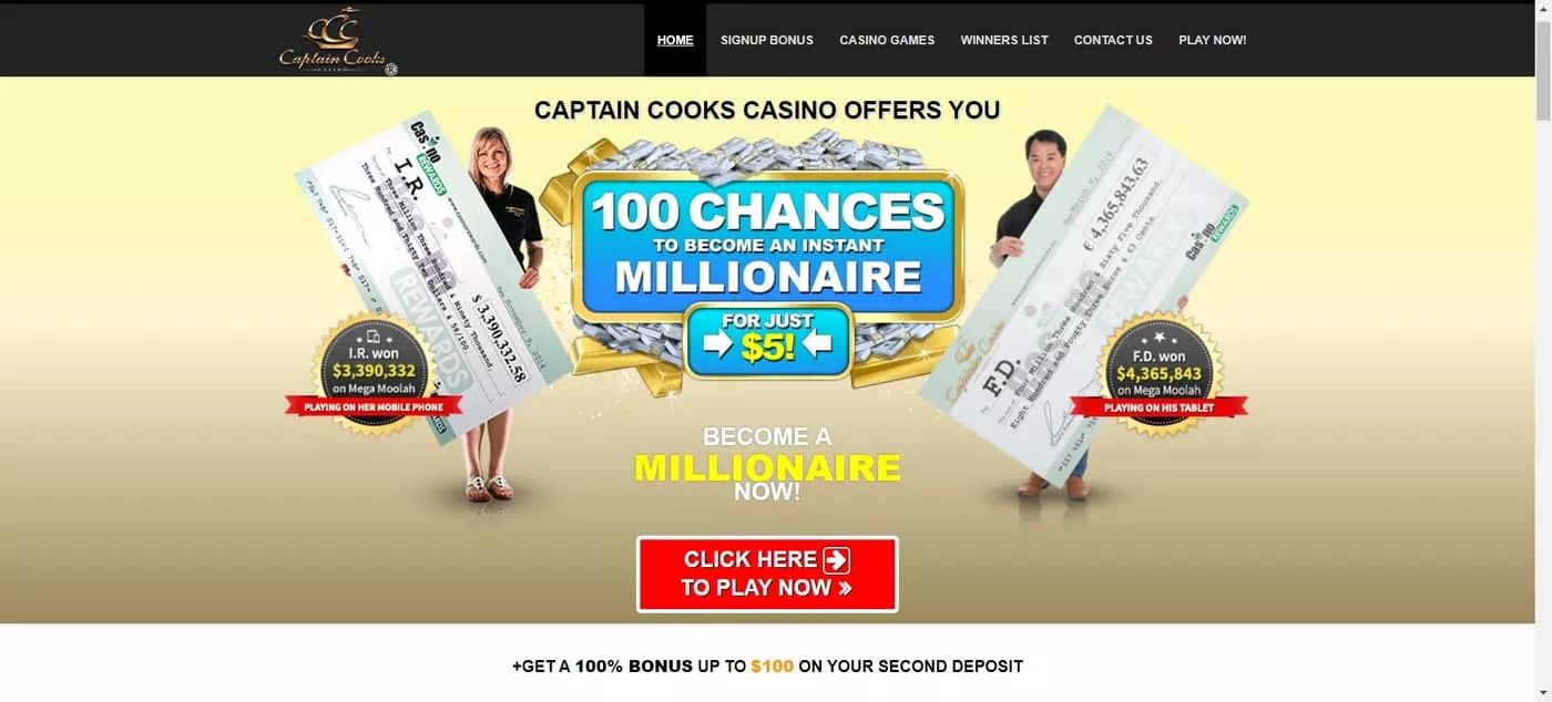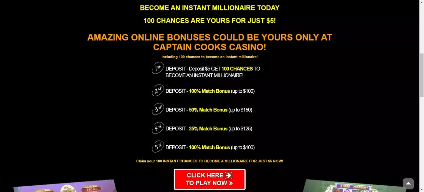 Bonusy v kasíne Captain Cooks sú štedré, no majú vysoké stávkové požiadavky. Pri prvom vklade získate 100 voľných točení na Mega Moolah jackpot za 5 €, so stávkovou požiadavkou 200x, ktorá sa pri druhom vklade zníži na 30x. Odporúčame si pred prijatím bonusov dôkladne prečítať všetky podmienky.
