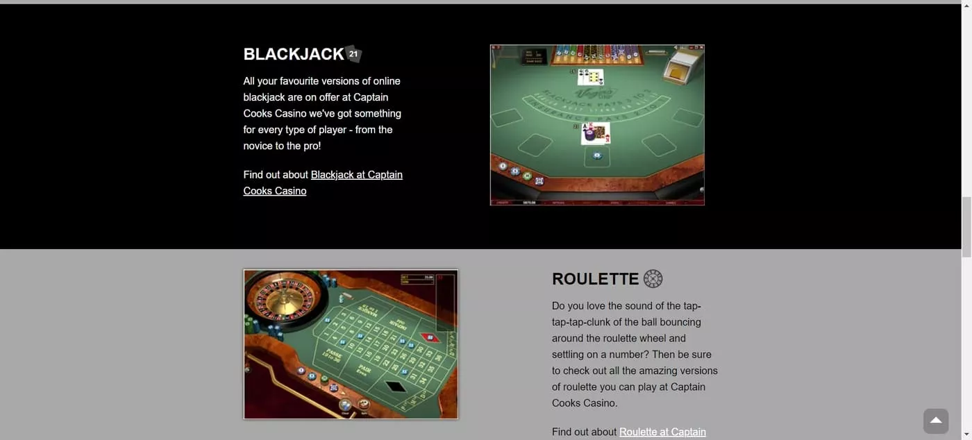 Ani v sekcii stolových hier nebude núdza o hodiny kvalitnej zábavy. Kasíno Captain Cooks ponúka hneď niekoľko druhov stolových hier. Medzi najznámejšie patria rôzne varianty rulety, blackjacku, pokru a baccaratu.